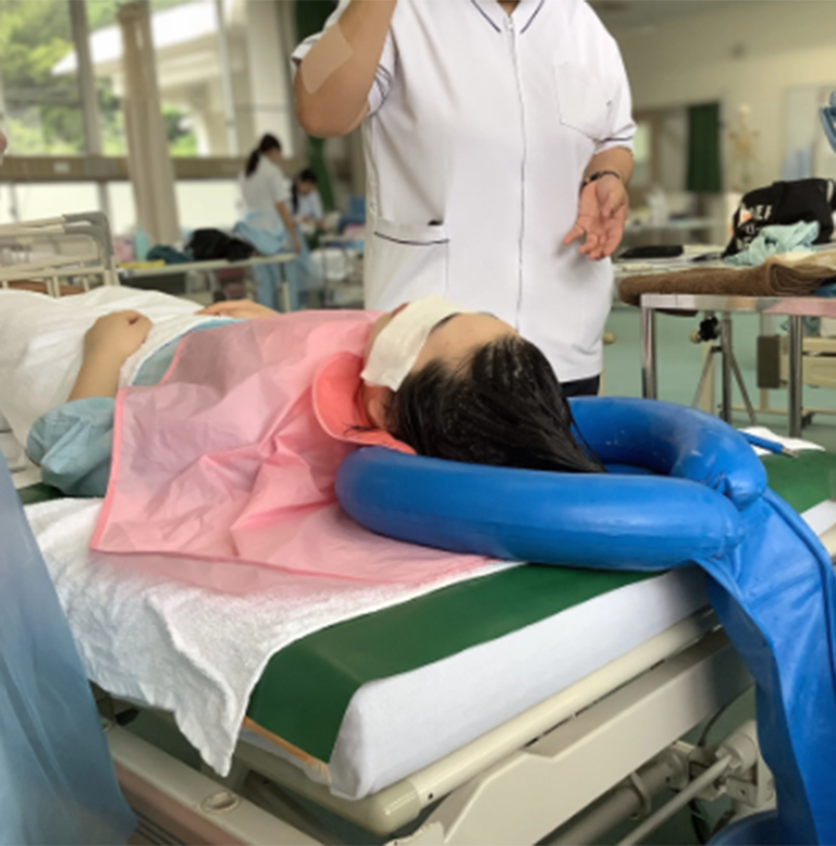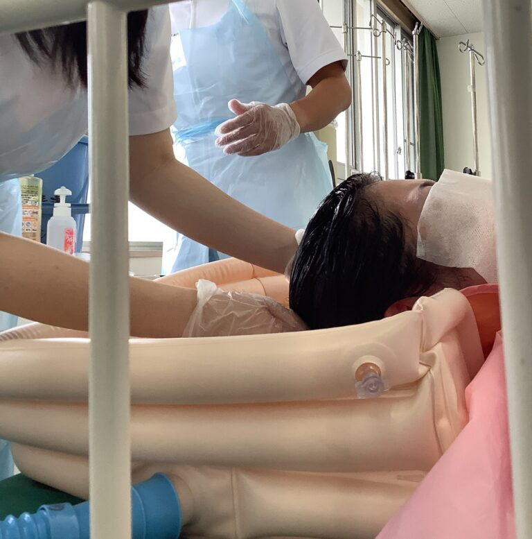 初めての洗髪の演習は、患者さんがベッドに寝たままで行う方法でした。