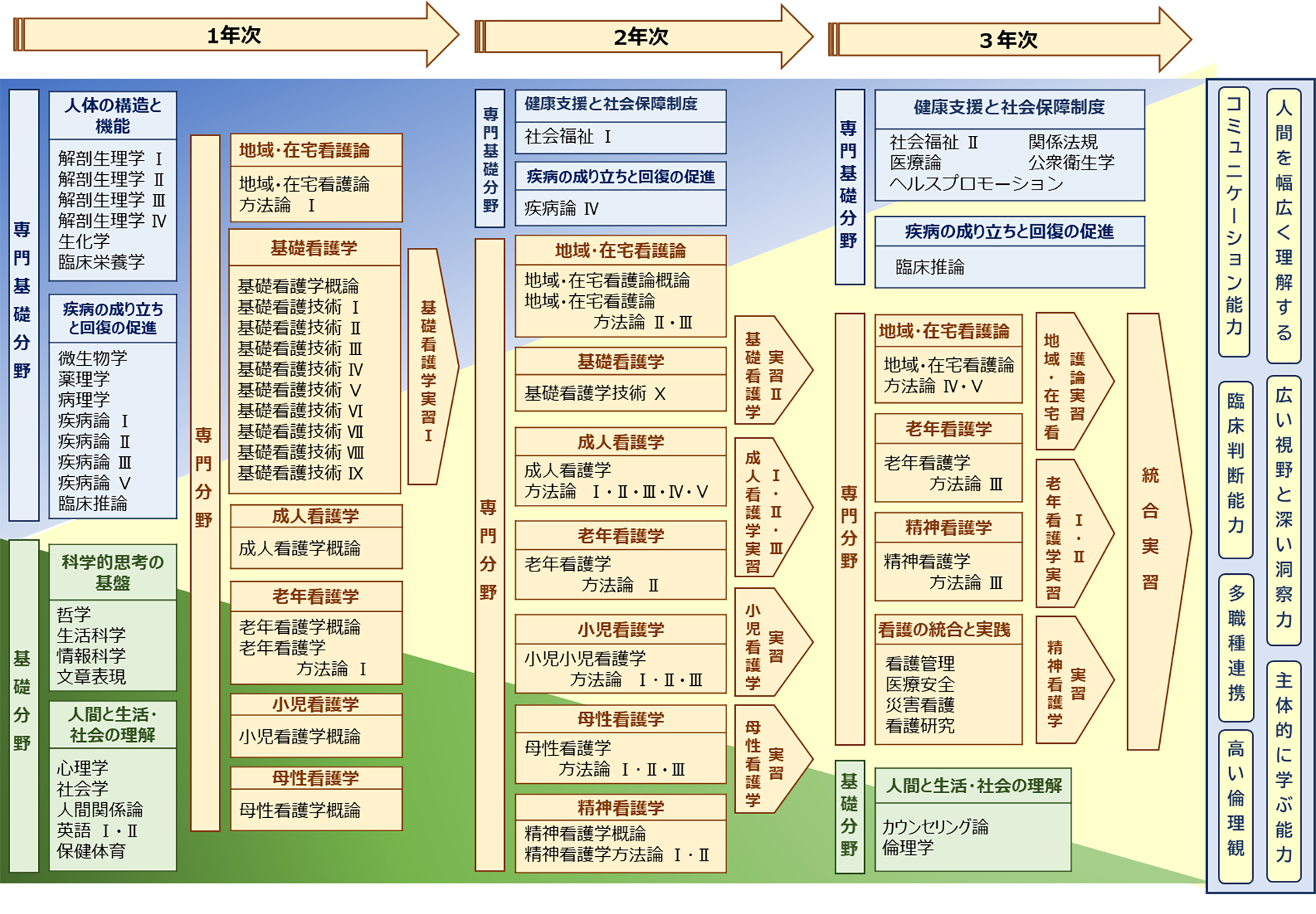 | 人体の構造と機能 解剖生理学 Ⅰ 解剖生理学 Ⅱ 解剖生理学 Ⅲ 解剖生理学 Ⅳ 生化学 臨床栄養学 疾病の成り立ちと回復の促進 微生物学 薬理学 病理学 疾病論 Ⅰ 疾病論 Ⅱ 疾病論 Ⅲ 疾病論 Ⅴ 臨床推論 | 科学的思考の基盤 哲学 生活科学 情報科学 文章表現 人間と生活・社会の理解 心理学 社会学 人間関係論 英語 Ⅰ・Ⅱ 保健体育 | 地域・在宅看護論 地域・在宅看護論方法論 I 基礎看護学 基礎看護学概論 基礎看護技術 Ⅰ 基礎看護技術 Ⅱ 基礎看護技術 Ⅲ 基礎看護技術 Ⅳ 基礎看護技術 Ⅴ 基礎看護技術 Ⅵ 基礎看護技術 Ⅶ 基礎看護技術 Ⅷ 基礎看護技術 Ⅸ 成人看護学 成人看護学概論 老年看護学 老年看護学概論 老年看護学方法論Ⅰ 母性看護学 母性看護学概論 |