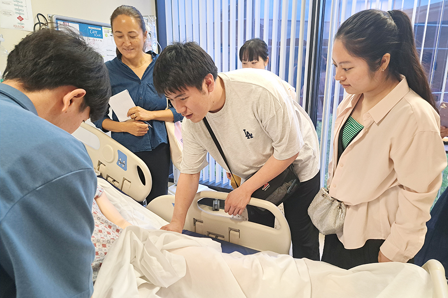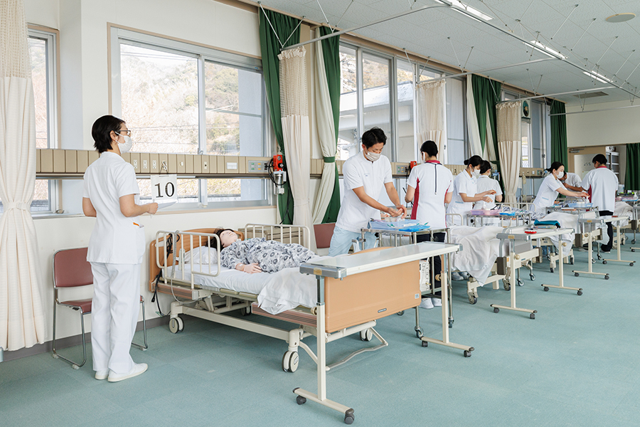各看護学毎にそれぞれ実習があります。 実習では学んだ知識や技術をもとに実際の患者様に応じて援助を行っていきます。 看護学校生活のほとんどは実習となり、色々な患者様と出会い様々な体験や実践を通して学んでいきます。 実習場には、教員が一緒に同行するため、患者様とのことで悩んだり、困ったことがあれば、その場ですぐに相談できるように現地でサポートしていますので安心して学べます。また、実習施設が多岐にわたるため、学校から現地まで学校バスにて送迎しています。