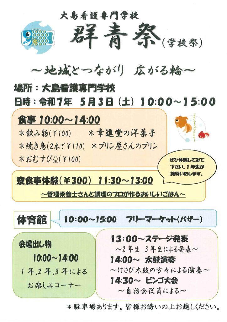 地域の方、入学をご検討の方、看護学校に興味のある方、保護者の方、卒業生、海辺をドライブ中の方など、たまたま周防大島に来ていた方もぜひ。駐車場は十分にございます。