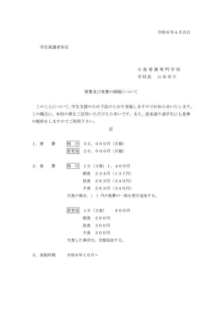 学生支援の観点から、令和6年10月から寮費と食費の改定を行います。