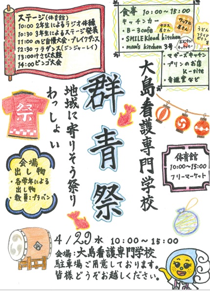 今年も大島看護専門学校の「群青祭」を開催いたします!学生による出し物、教員によるプラバン作成など楽しい内容が盛りだくさん!